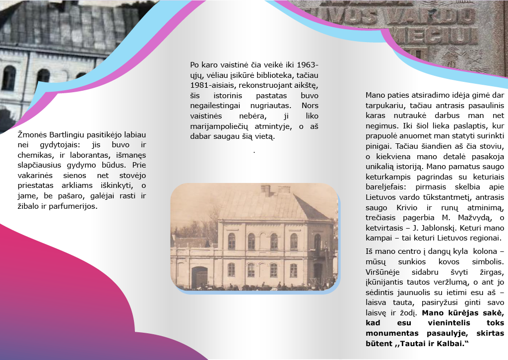 Istorijos mokytoja J. Pautienienė su mokiniais rinko informaciją apie žinomas Marijampolės istorines vietas ir paminklus. Mokiniai tyrė pasirinkto objekto istoriją ir rengė jo pristatymą. Paruošė lankstinuką lietuvių kalba. Pagal surinktą medžiagą anglų kalbos pamokose buvo kuriamas pristatymas ir įgarsinamas paminklo monologas. Darbą pažiūrėti galima: https://www.storyjumper.com/book/read/188315911/69a96f567ec2e Kad užduotis būtų inovatyvi, dalis veiklos vyko Marijampolės regioniniame STEAM atviros prieigos centre.