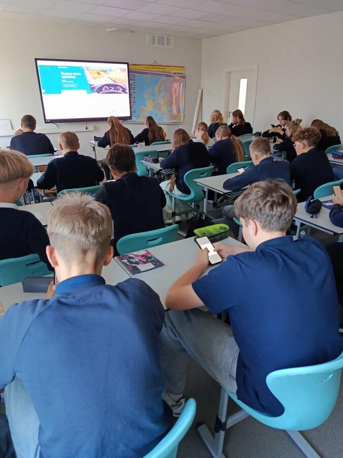 7–8 klasių mokiniai sprendė interaktyvų testą, analizavo kasdienes eismo situacijas, aptarė saugumo svarbą ir sužinojo naujų faktų apie atsakingą dalyvavimą eisme.