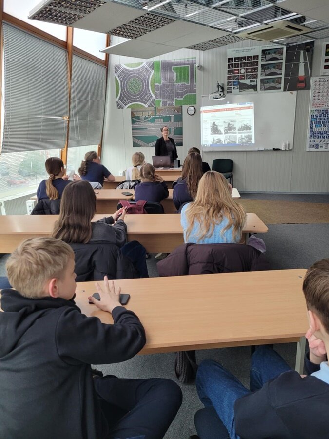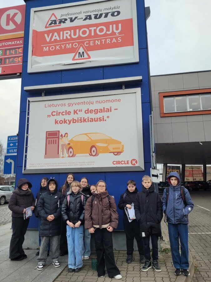 Lapkričio 21 dieną finansinio raštingumo būrelio nariai lankėsi vieno iš tėvų darbovietėje – profesionalioje vairavimo mokykloje ARV-AUTO. Mokinius pasitiko šios mokyklos administratorė Jurgita Juodsnukienė, Deivido mama, kuri ne tik labai įdomiai papasakojo apie šios mokyklos teikiamas paslaugas, bet ir atsakė į mokinių užduotus klausimus. Ar reikia dviratininkui teisių? Kiek kainuoja išsilaikyti vairavimo teises? Nuo kiek metų galima vairuoti automobilį, mopedą, motorolerį? Kokiais automobiliais yra mokoma vairuoti jų mokykloje? Kokio amžiaus buvo vyriausias jų mokinys? Be to, mokiniai atliko saugaus eismo testą ir taip pasitikrino savo žinias.