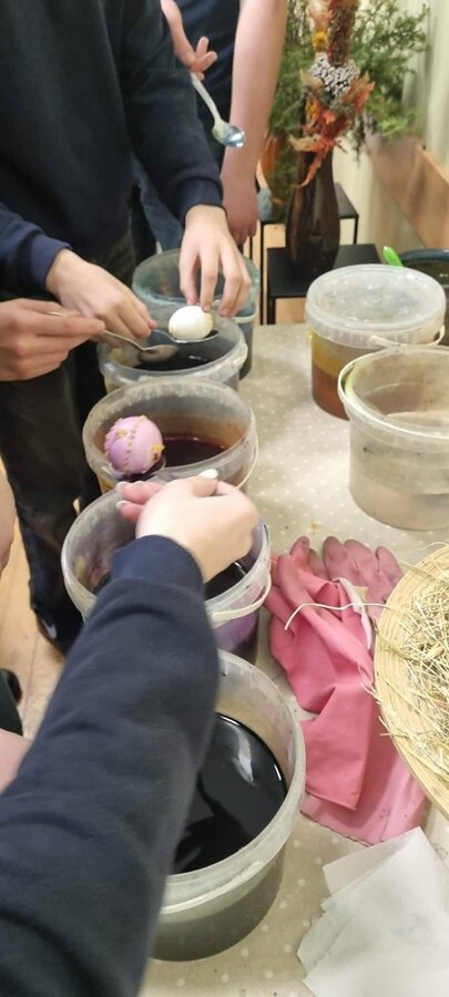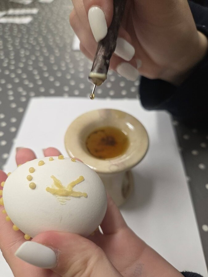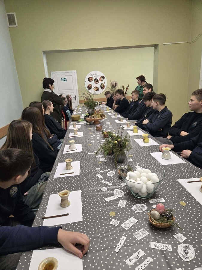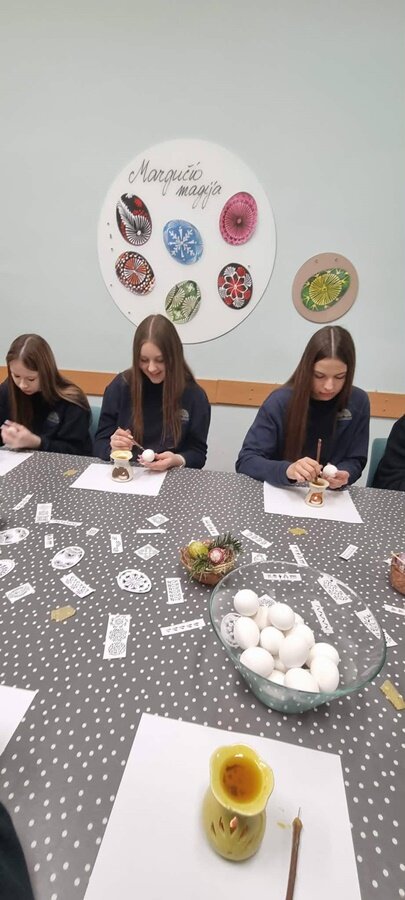 Mokiniai ne tik apžiūrėjo marginimo priemones, sužinojo, kaip jas pasigaminti ir paruošti kiaušinius, bet ir patys išbandė šią techniką. Marginant pirmąjį kiaušinį kūrė ornamentus iš taškelių ir brūkšnelių, o antrąjį – drąsiai eksperimentavo, leisdami pasireikšti savo kūrybiškumui