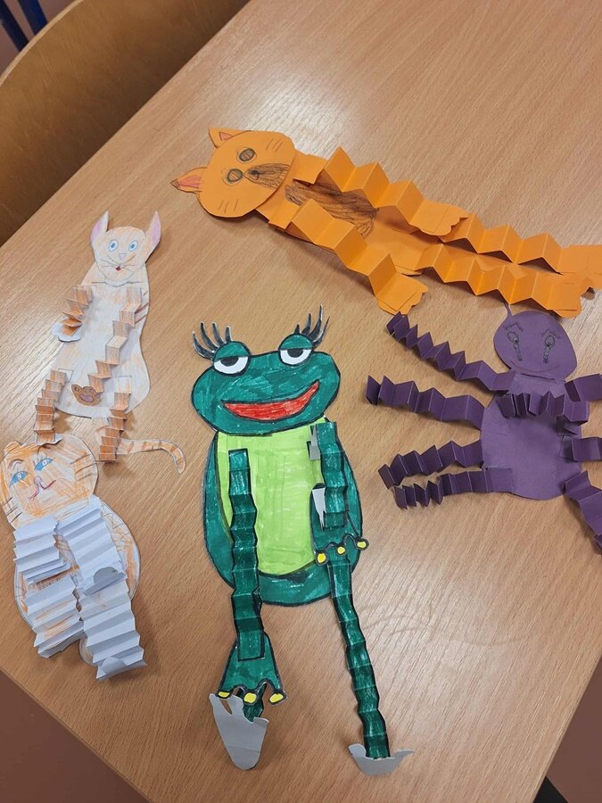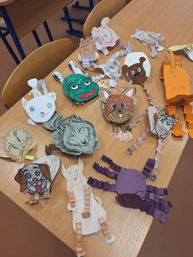 2a, 2b, 2c mokiniai anglų kalbos pamokoje kūrybiškai taikė STEAM metodą. Pirmiausia jie pagamino gyvūnėlius iš popieriaus (menas + inžinerija), naudodami lankstymo ir kirpimo technikas. Kurdami, vaikai turėjo apgalvoti, kaip atrodys jų gyvūnas. Vėliau kiekvienas mokinys anglų kalba trumpai pristatė savo sukurtą gyvūnėlį: įvardijo jo pavadinimą, spalvą, kokias kūno dalis jis turi ir ką jis mėgsta veikti (kalba + mokslas). Ši veikla skatino kūrybiškumą, kalbėjimo įgūdžius bei tarpdalykines jungtis.